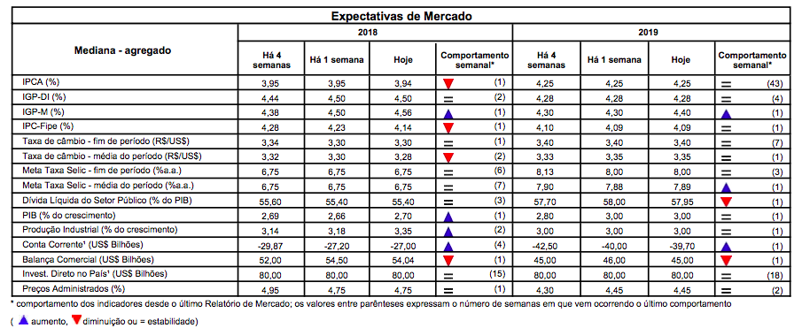 Já a projeção para a inflação (IPCA) recuou de 3,95% a 3,94% para 2018 e continua em 4,25% para 2019 (assim como há quatro semanas).