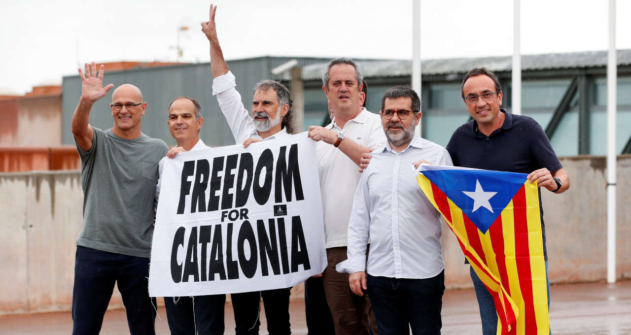 Portando um cartaz que exigia “liberdade para a Catalunha“, líderes separatistas que foram presos devido ao seu papel em uma tentativa de independência fracassada de 2017 saíram da prisão nesta quarta-feira depois de receberem indultos do governo espanhol.