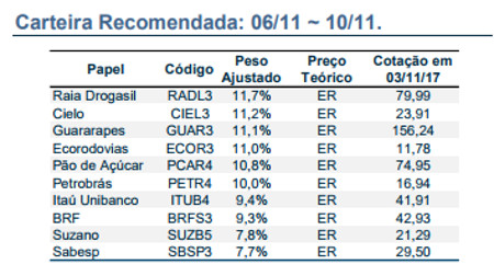 A equipe de da corretora optou por manter a lista. “Em nosso seleto portfólio, ITSA4, PETR4 e TEND3, ainda divulgarão seus balanços do 3º tri nos próximos dias, onde a expectativa segue positiva para esses papéis. Isto é algo que contribui para permanecermos sem alterações para essa semana”.