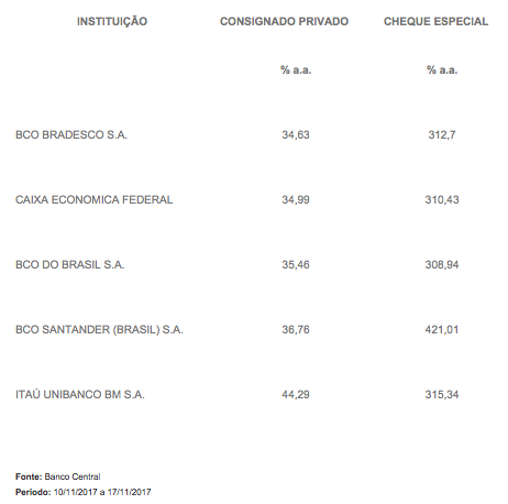 Se você é do time que usa sempre o cheque especial, preste muita atenção. Você precisa trocar essa dívida por uma mais barata, como o empréstimo consignado, que oferece taxas de juros com valores bem abaixo do cheque especial. Segundo o Banco Central (tabela abaixo), no período de 10/11/2017 a 17/11/2017, a taxa média cobrada no cheque especial nos cinco principais bancos brasileiros variou entre 308% a.a. e 421% a.a., enquanto no empréstimo consignado privado variou entre 34% a.a. e 44% a.a.