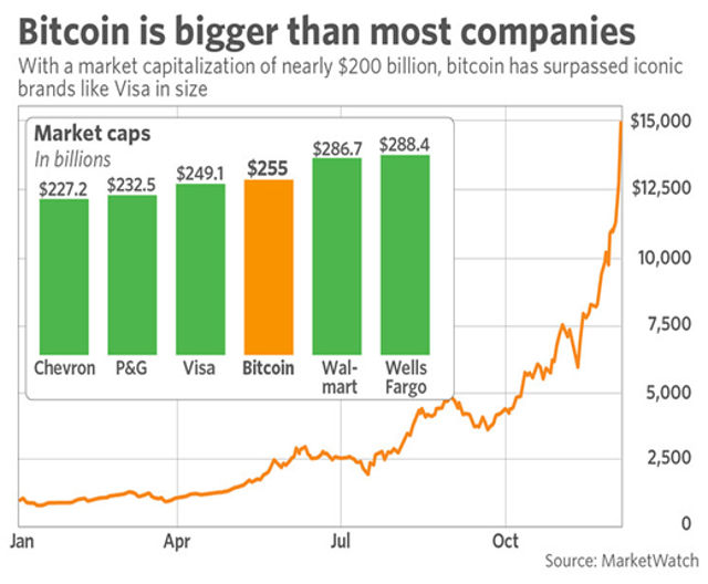 A maior parte de todo esse interesse está focada no bitcoin, possivelmente a criptomoeda mais popular do mundo. Começou em 2017 em US$ 966,60 antes de subir para um máximo histórico de US$ 17.500,00 em 12 de dezembro, registrando um ganho acumulado anual de aproximadamente 1.600%. O último preço do bitcoin foi de US$ 16.600,00, dando-lhe uma capitalização de mercado de aproximadamente US$ 275 bilhões, maior do que algumas das mais antigas ações blue chips e das marcas mais famosas do mundo.