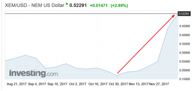 O preço do NEM em 1 de janeiro era de US$ 0,003676. Desde então, teve uma recuperação notável de 14.617%, para US$ 0,52370 tornando-se a 10ª maior criptomoeda em circulação, com capitalização de mercado de cerca de US$ 4,9 bilhões.