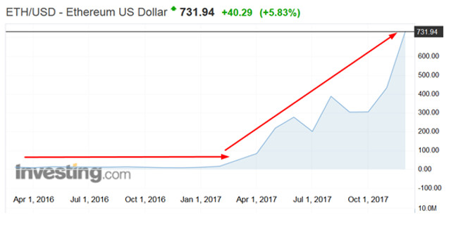 O preço de fechamento de uma moeda ethereum em 31 de dezembro de 2016 era de apenas US$ 8,17. Agora é de cerca de US$ 730,00, representando um ganho impressionante de quase 9.200%. Teve um pico histórico de US$ 756,00 em 14 de dezembro.