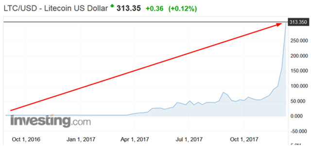 O litecoin iniciou o ano em US$ 4,51. Surpreendentemente, aumentou para cerca de US$ 315,00 no momento da redação, para um notável ganho acumulado anual de até 6.921%. Nos níveis atuais, a capitalização de mercado do litecoin é de US$ 16,5 bilhões, tornando-se a quinta maior criptomoeda.
