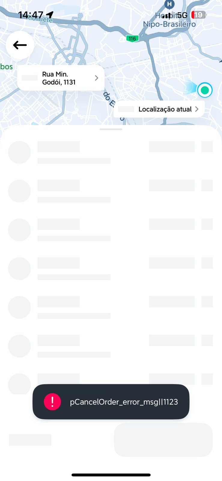 Ao abrir o aplicativo, tudo parecia normal. No entanto, ao solicitar uma corrida, o problema surgia. Quando o usuário escolhia o destino, a categoria do veículo e chamava um motorista, o sistema apresentava o erro “pCancelOrder_error_msgll1123” e cancelava automaticamente o pedido.