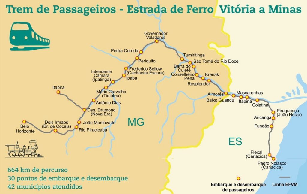 Há mais de 120 anos, a Estrada de Ferro Vitória a Minas (EFVM) — cuja malha é concessionada à Vale — interliga os dois estados com um Trem de Passageiros que realiza viagens diariamente.