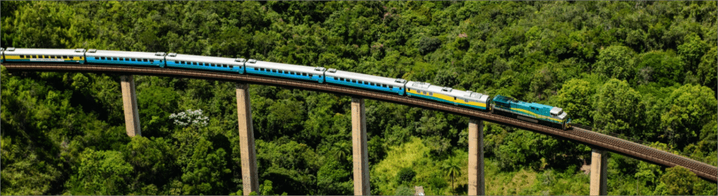 Ao longo desse tempo, o trem atravessa 42 municípios, revelando paisagens naturais, memórias ferroviárias e marcas da mineração brasileira que surgem pela janela como capítulos de um mesmo livro.