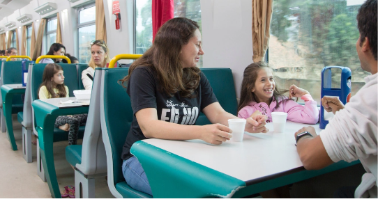 O trem conta com vagões-restaurante e lanchonete, espaços onde o passageiro pode fazer uma pausa e aproveitar a viagem com mais calma.