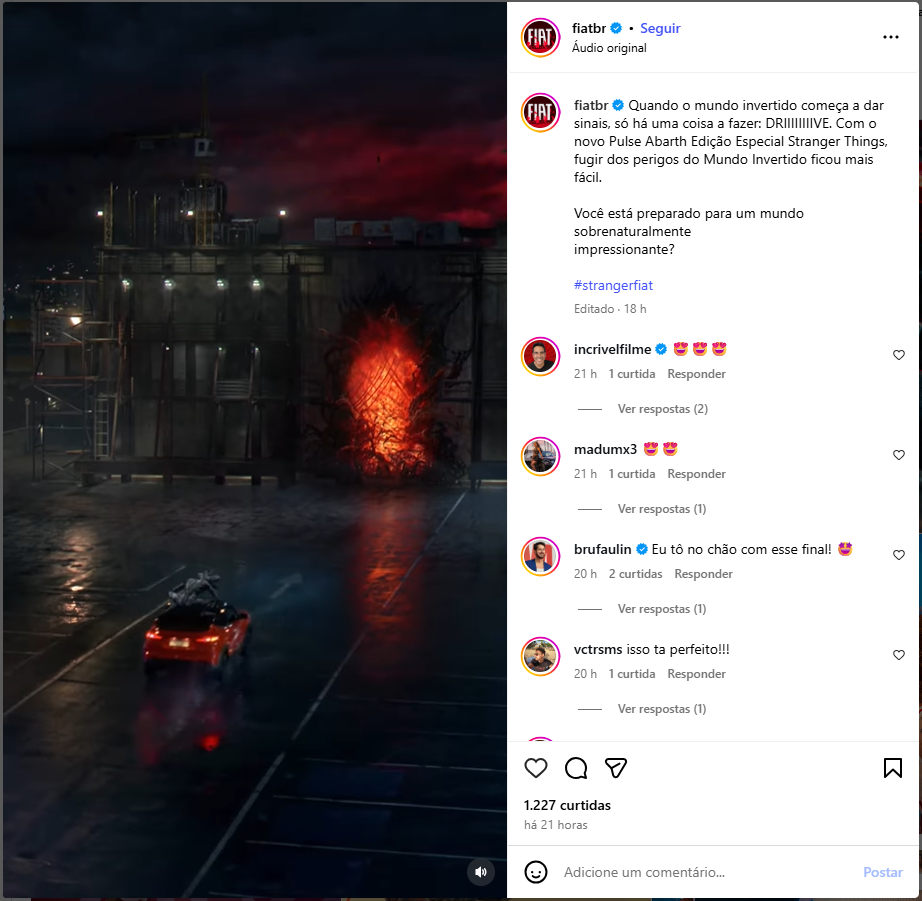 Até o novo Pulse da FIAT resolveu “dar fuga” em Hawkins. “Quando o mundo invertido começa a dar sinais, só há uma coisa a fazer: DRIIIIIIIIVE. Com o novo Pulse Abarth Edição Especial Stranger Things, fugir dos perigos do Mundo Invertido ficou mais fácil”.