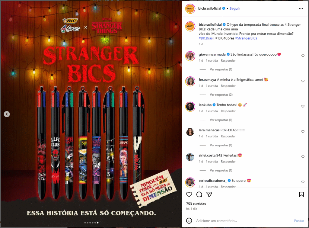 As canetas mais tradicionais do mercado também quiseram surfar nesse momento. A BIC lançou a linha “Stranger Bics”, brincando com um dos clássicos da marca: “Ninguém perde uma BIC, ela só muda de dimensão.”