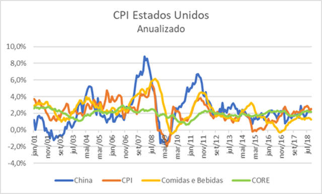 Agora a curiosidade me levou para o lado da composição do índice de preços americanos (CPI). Como estão os componentes da inflação ao consumidor e como estão se comportando? Primeiro vamos analisar o índice cheio de preços ao consumidor, em seguida, o core (preços menos alimentos, bebida e energia, dado que estes dois itens são muito voláteis e o CORE tem objetivo de medir apenas a variação dos itens que não sofrem muito com variações maiores), depois, o índice apenas com alimentos e bebidas e, por fim, o índice que mede o preço médio das importações chinesas nos EUA.