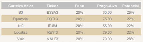 A carteira é composta por Equatorial (EQTL3) e Vale (VALE3) no campo mais defensivo em relação ao Brasil, e B3 (B3SA3), Itaú (ITUB4) e Localiza (RENT3) nos nomes mais ofensivos que se beneficiam da potencial retomada econômica no Brasil, sendo todos nomes de qualidade com gestão de primeira linha.