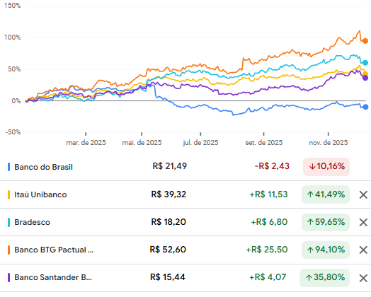 Na bolsa, enquanto outros bancos — como Itaú (ITUB4), Bradesco (BBDC4) e BTG (BPAC11) — dispararam mais de 50%, o Banco do Brasil deve encerrar o ano com queda de 10%. Em relação à máxima de 2025, o tombo chega a 29%.