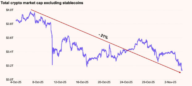 A capitalização total do mercado cripto recuou cerca de 21% desde o início de outubro, passando de US$ 3,9 tri para US$ 3,1 tri, em um movimento que se assemelha mais a uma consolidação saudável do que a um sell-off em pânico.