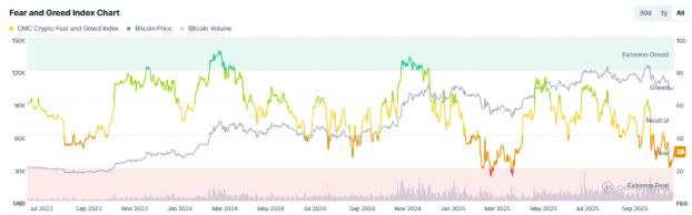 O sentimento do mercado voltou para a zona de “Medo”, com o Fear & Greed marcando 29, patamar que historicamente costuma sinalizar áreas de acumulação.