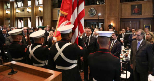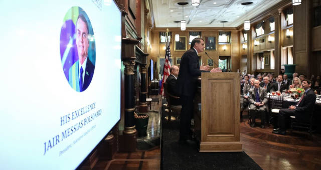 Dirigindo-se a uma plateia formada basicamente por empresários, Bolsonaro criticou a política de governos anteriores em relação aos Estados Unidos e prometeu maior aproximação: “No Brasil, a política, até há pouco, era de antagonismo a países como os Estados Unidos. Os senhores eram tratados como inimigos nossos. (…) O Brasil de hoje é amigo dos EUA, respeita os EUA, quer o povo americano e os empresários americanos ao nosso lado”. O presidente disse estar convicto de que a união e a confiança entre os dois países podem levar à ampliação do comércio e à assinatura de acordos entre os dois governos.