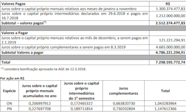 De acordo com o comunicado, o pagamento ocorrerá em 8 de março de 2019 terá valor líquido de R$0,564247621 por ação ordinária e R$0,620672383 por ação preferencial, já deduzido o IR (Imposto de Renda) na fonte de 15%..