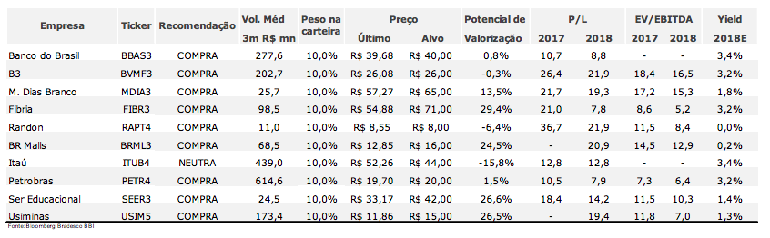 Em janeiro, a Carteira Top 10 subiu 16%, enquanto o Ibovespa avançou 11,1%. “Seguimos com uma visão construtiva para o mercado brasileiro de capitais nos próximos anos, sustentada principalmente pelo crescimento do PIB e pela expectativa de retomada dos lucros, ao mesmo tempo em que as condições globais sugerem a manutenção do apetite ao risco”, escreve o time da Bradesco Corretora, enfatizando a seletividade na escolha dos ativos diante do risco eleitoral.