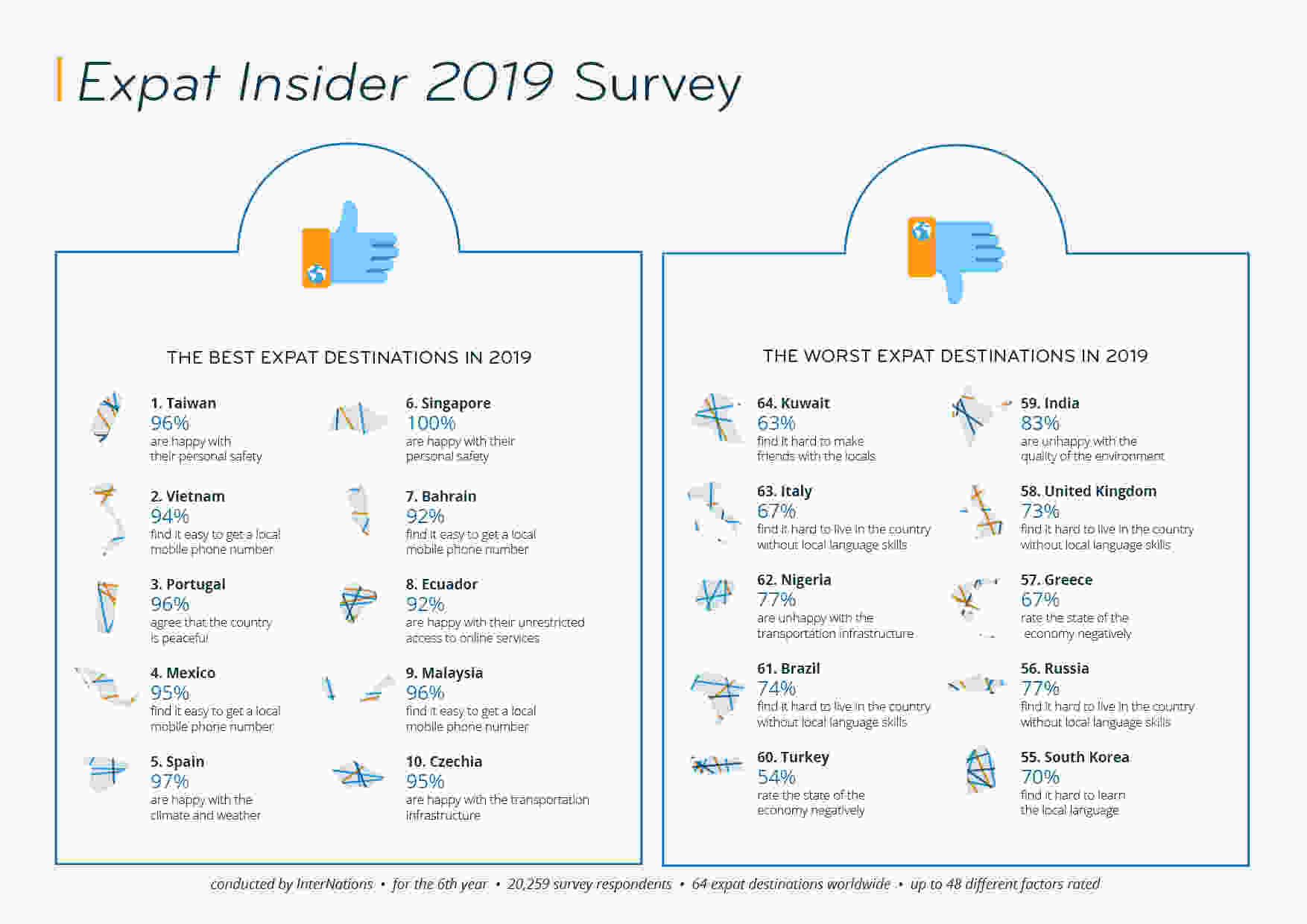 Taiwan lidera a pesquisa dos principais destinos para expatriados. A nação se sobressai pela boa qualidade de vida, ocupando o terceiro lugar, e um sistema de saúde acessível. Expatriados também se dizem felizes com a segurança pessoal em Taiwan. 78% também mencionam a facilidade em se acomodar na região.