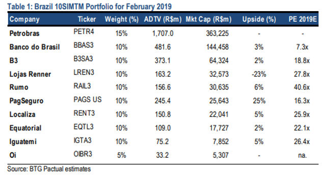 A exposição à gigante petrolífera estatal Petrobras foi mantida, assim como ao Banco do Brasil (BBAS3), à principal locadora de veículos, a Localiza (RENT3), à renomada varejista de vestuário Renner (LREN3), à brasileira B3 (B3SA3) e à operadora de ferrovias Rumo (RAIL3). O portfólio é completado por operadora de telecomunicações Oi (OIBR3).