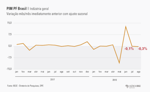 Por IBGE – A produção industrial brasileira recuou 0,3% na passagem de julho para agosto deste ano, de acordo com os dados da Pesquisa Industrial Mensal (PIM-PF), divulgada hoje pelo IBGE. Esse foi o segundo mês seguido de comportamento negativo, acumulando uma perda de 0,4% no período. O gerente da pesquisa, André Macedo, ressalta que desde o final de 2015, a indústria não apresentava dois recuos consecutivos na produção.