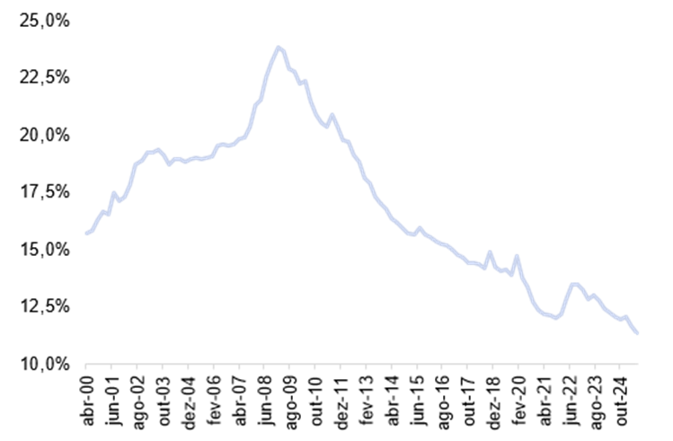 O consumo segue resiliente também porque a taxa de poupança dos EUA está baixa, em apenas 3,5%, abaixo da média histórica de 6,3%, indicando maior propensão a gastar em 2025.