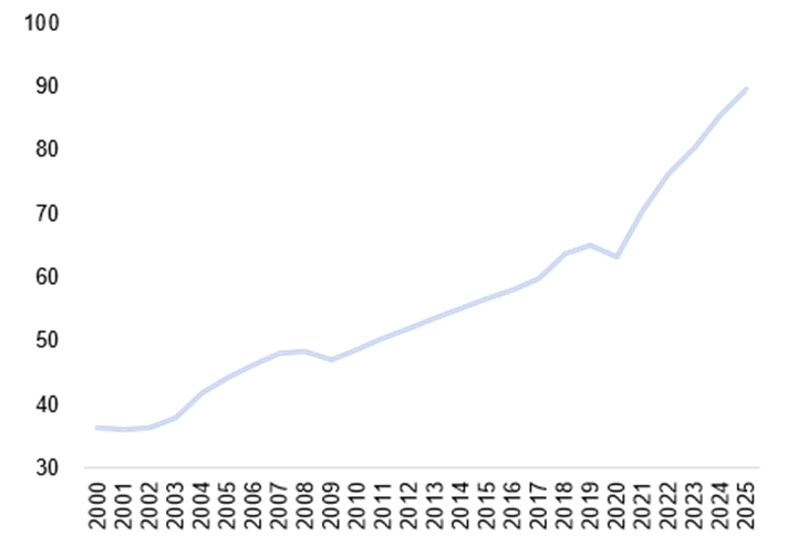A renda média do consumidor norte-americano alcançou cerca de US$ 90 mil por ano em 2025. Desde 2000, o crescimento composto ficou próximo de 3,7% ao ano, mostrando resiliência ao longo de diferentes ciclos, crises e choques.