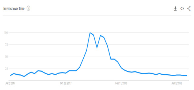 Outra fonte de preocupação para os touros das criptomoedas tem sido o contínuo declínio do interesse geral na classe de ativos, algo que pode ser visto claramente ao observar rapidamente as tendências de pesquisa do Google nos últimos meses: