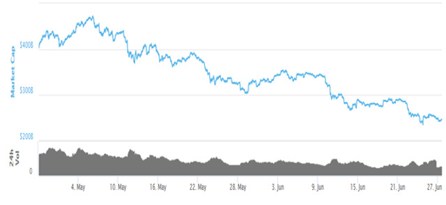 Por Jesse Cohen/Investing.com – O mês de junho foi novamente negativo no criptomercado, com as principais moedas tendo sofrido perdas de dois dígitos, decepcionado os investidores que esperavam uma recuperação após um mês de maio cheio de dificuldades. As moedas digitais foram pressionadas por uma série de más notícias nas últimas semanas, incluindo uma invasão na bolsa de criptomoedas Bithumb da Coreia do Sul — uma das maiores bolsas de valores da Ásia.