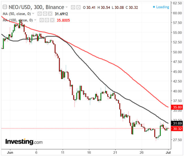 O NEO, apelidado por muitos apaixonados por de criptomonedas como o ‘ethereumda China’, é uma plataforma de blockchain e criptomoedas que permite o desenvolvimento de contratos inteligentes e ativos digitais. O preço de uma moeda NEO ficou em US$ 55,61 em 1º de junho, antes de a moeda despencar para a mínima de US$ 27,08, em 29 de junho.