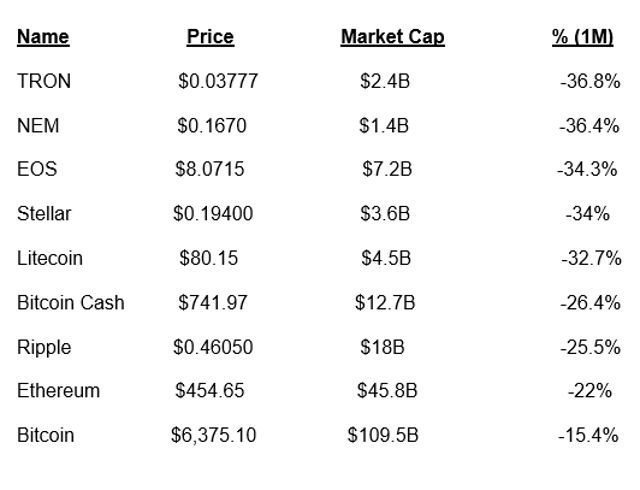 Além das três moedas digitais mencionadas acima, outras grandes perdedoras neste mês incluem o TRON, EOS, stellar, litecoin, bitcoin cash e ripple: