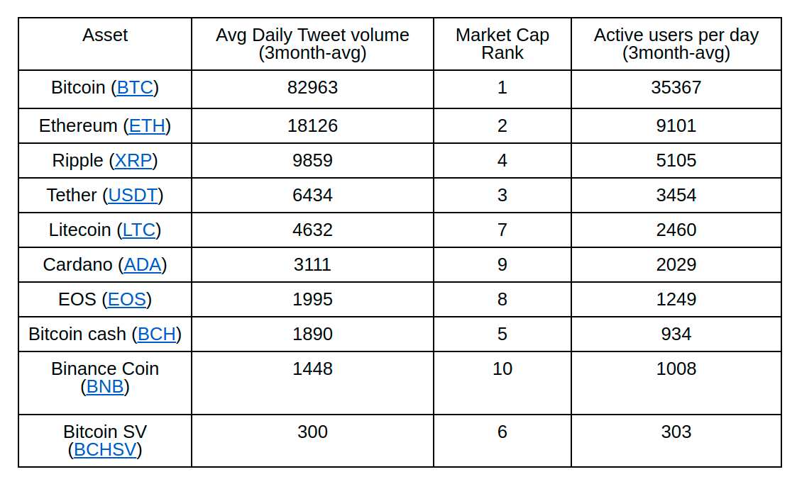 O grupo das altcoins (criptomoedas alternativas ao bitcoin) de grande capitalização mostra um grande número de atividades no Twitter:
