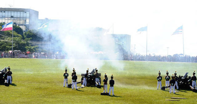 Encerrada a sessão, o presidente da República, já empossado, desce a rampa do Palácio do Congresso Nacional e, como comandante-chefe das Forças Armadas, passará em revista as tropas da Marinha, do Exército e da Aeronáutica, sendo ainda homenageado com uma salva de 21 tiros de canhão.