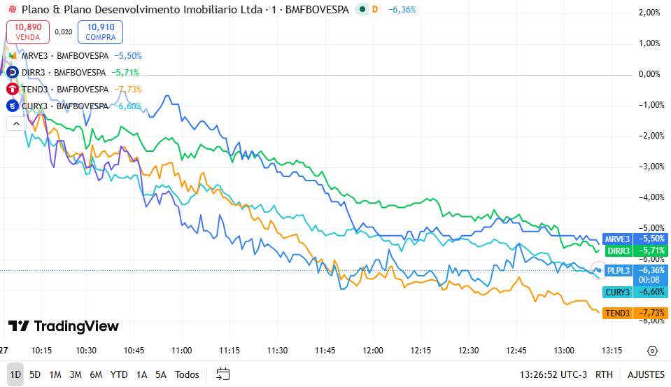 Ainda assim, as ações de MRV (MRVE3), Direcional (DIRR3), Tenda (TEND3), Plano & Plano (PLPL3) e Cury (CURY3) caíam 3,29%, 3,07%, 5,72%, 6,56% e 4,61%, respectivamente, às 11h50 (horário de Brasília).