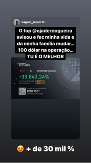 Em outro caso, uma operação envolvendo a criptomoeda terra luna (LUNA), chegou a multiplicar seu capital em até 1.300 vezes. Ao longo da carreira, também capturou valorizações de 32.000%, 60.000% e até 130.000%.