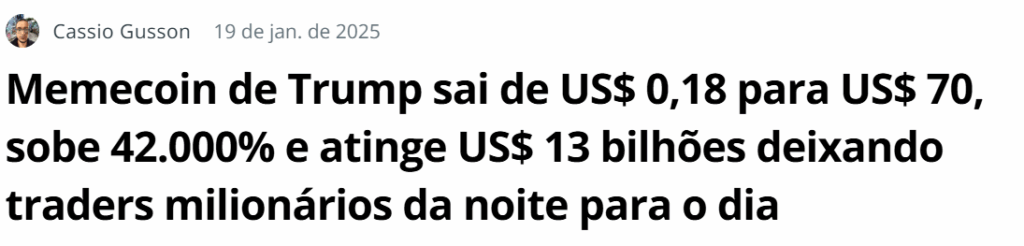 As memecoins são moedas criadas a partir de narrativas e brincadeiras. Quando elas “viralizam” o preço dispara e o investidor pode lucrar muito em pouco tempo. Veja só um exemplo: