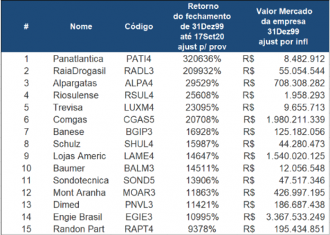 Se você não “põe fé” nas microcaps, a lista abaixo explica o sucesso dessas companhias. Max fez um estudo aprofundado das ações que mais se valorizaram nos últimos 20 anos (entre 2000 e 2020). Mesmo com todas as notícias que aconteceram no período, de ciclos de altas e baixas na bolsa, ele concluiu que estes foram os papéis que mais se destacaram: