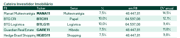 Como você pode perceber, em poucos segundos, a ferramenta apresenta um planejamento estratégico, incluindo os fundos imobiliários recomendados e o nível de alocação em cada um deles.