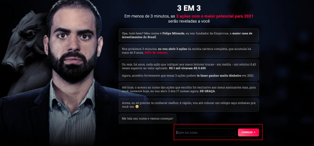 Isso mesmo. Em uma iniciativa inédita, Felipe Miranda, CIO da Empiricus, decidiu revelar gratuitamente o nome das três ações que, na visão dele, podem ser as responsáveis por entregar as maiores altas do ano.