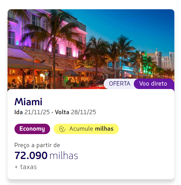 - Seus 70.000 pontos se transformam em 140.000 milhas aéreas, suficientes para uma viagem ida e volta para Miami saindo de São Paulo, por exemplo: