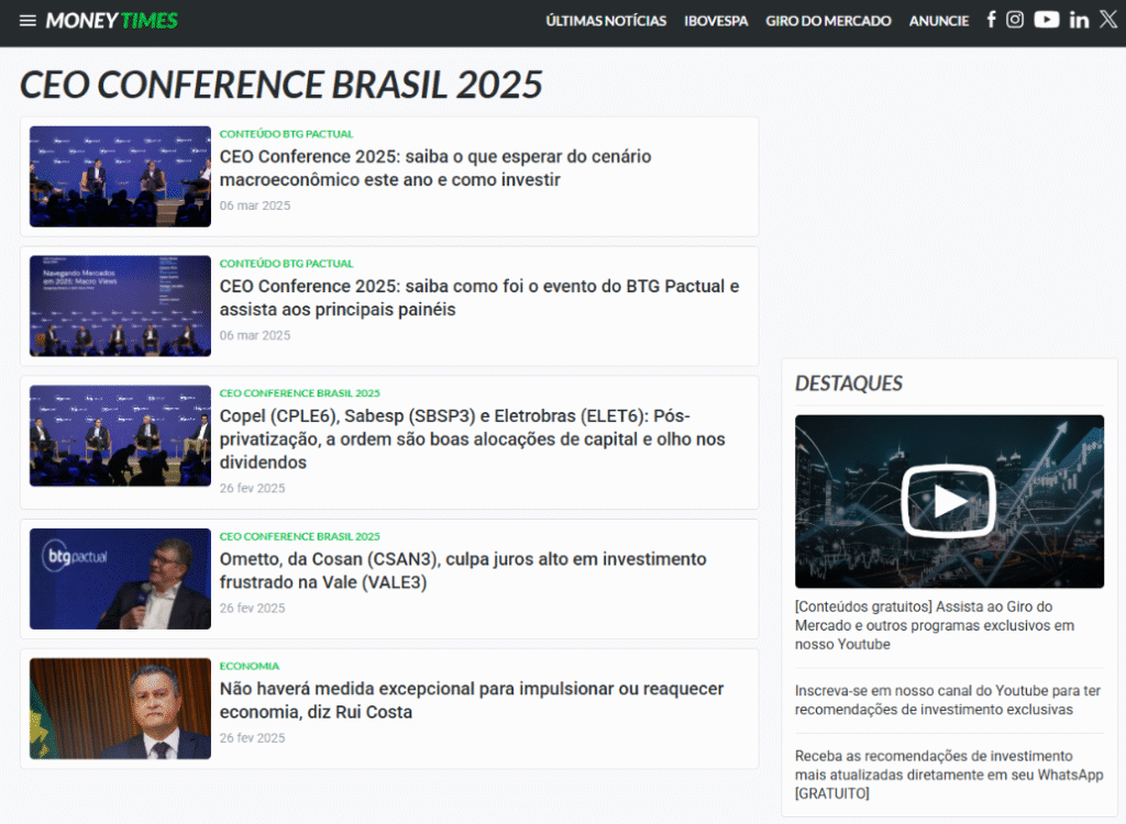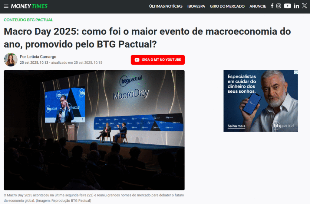 Em 2025, o portal realizou a cobertura de três eventos corporativos do BTG Pactual por meio de parceria comercial: Agroforum, CEO Conference e Macro Day, realizados entre os meses de fevereiro e setembro deste ano.