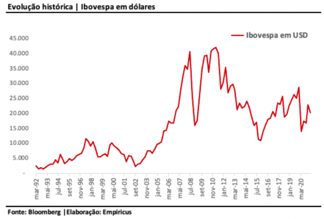 Ele representa a evolução histórica do nosso índice, em dólares. Note que estamos muito abaixo da máxima registrada de 44.616 pontos. Mais precisamente, o nosso índice negocia hoje na casa dos 20 mil pontos, também em dólares.