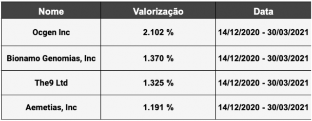 - E, como o mercado tem a tendência de antecipar os movimentos, olha só as maiores valorizações registradas no país desde o dia 14/12/2020, data do início da vacinação. Já teve empresa que multiplicou por mais de 22 vezes o investimento dos seus acionistas.