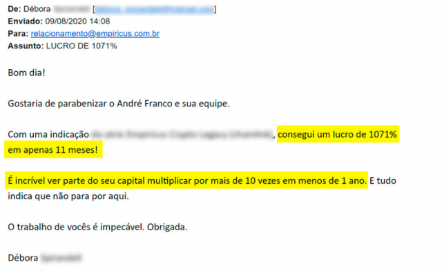 E mais diversas outras séries que puderam multiplicar e proteger o patrimônio dos leitores da Empiricus mesmo em momentos de crise. Veja um depoimento abaixo: