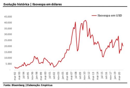 Ele representa o desempenho histórico do Ibovespa em dólar. Hoje, ele está sendo negociado a 21.279 pontos, menos da metade da sua máxima histórica de 45.000 pontos.