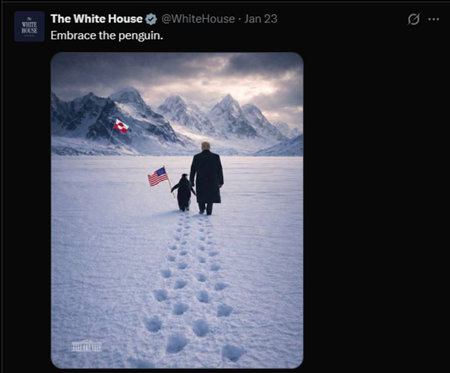 Uma publicação da Casa Branca dos Estados Unidos fez disparar em 564% em apenas 24 horas a memecoin PENGUIN. A imagem publicada via X (antigo Twitter) faz alusão à menina dos olhos de ouro de Trump mais recente: a Groenlândia.