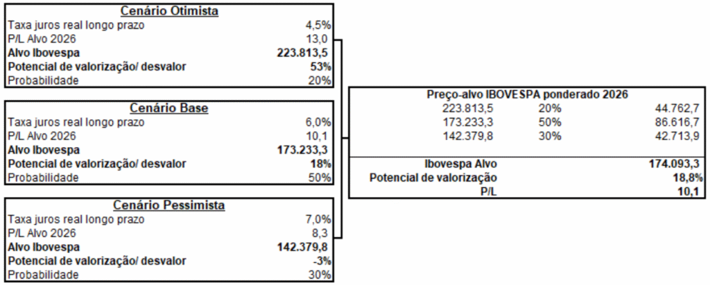 Segundo o cenário-base dos especialistas, o preço-alvo do Ibovespa para 2026 está acima dos 170 mil pontos, o que significa uma alta de cerca de 10% em relação ao patamar atual.