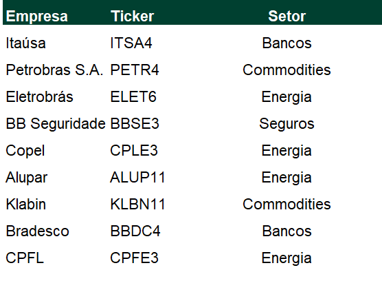 Essa foi a sugestão do simulador para quem deseja buscar R$ 10 mil de renda mensal com ações brasileiras. Como você pode ver, a carteira sugerida trouxe papéis de empresas: