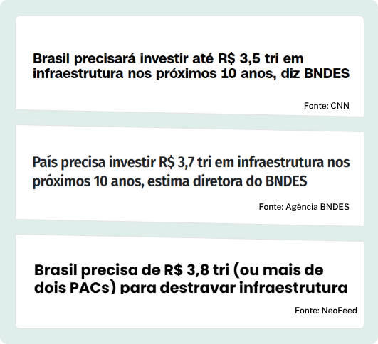 De acordo com o BNDES (Banco Nacional de Desenvolvimento Econômico e Social), o Brasil precisará investir até R$ 3,7 trilhões em infraestrutura nos próximos 10 anos: