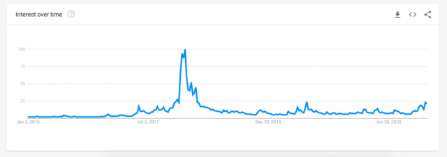 Mas desta vez parece ser diferente. A palavra teve sim maior interesse comparado aos outros momentos, mas não chega nem perto do pico de interesse presenciado em 2017.